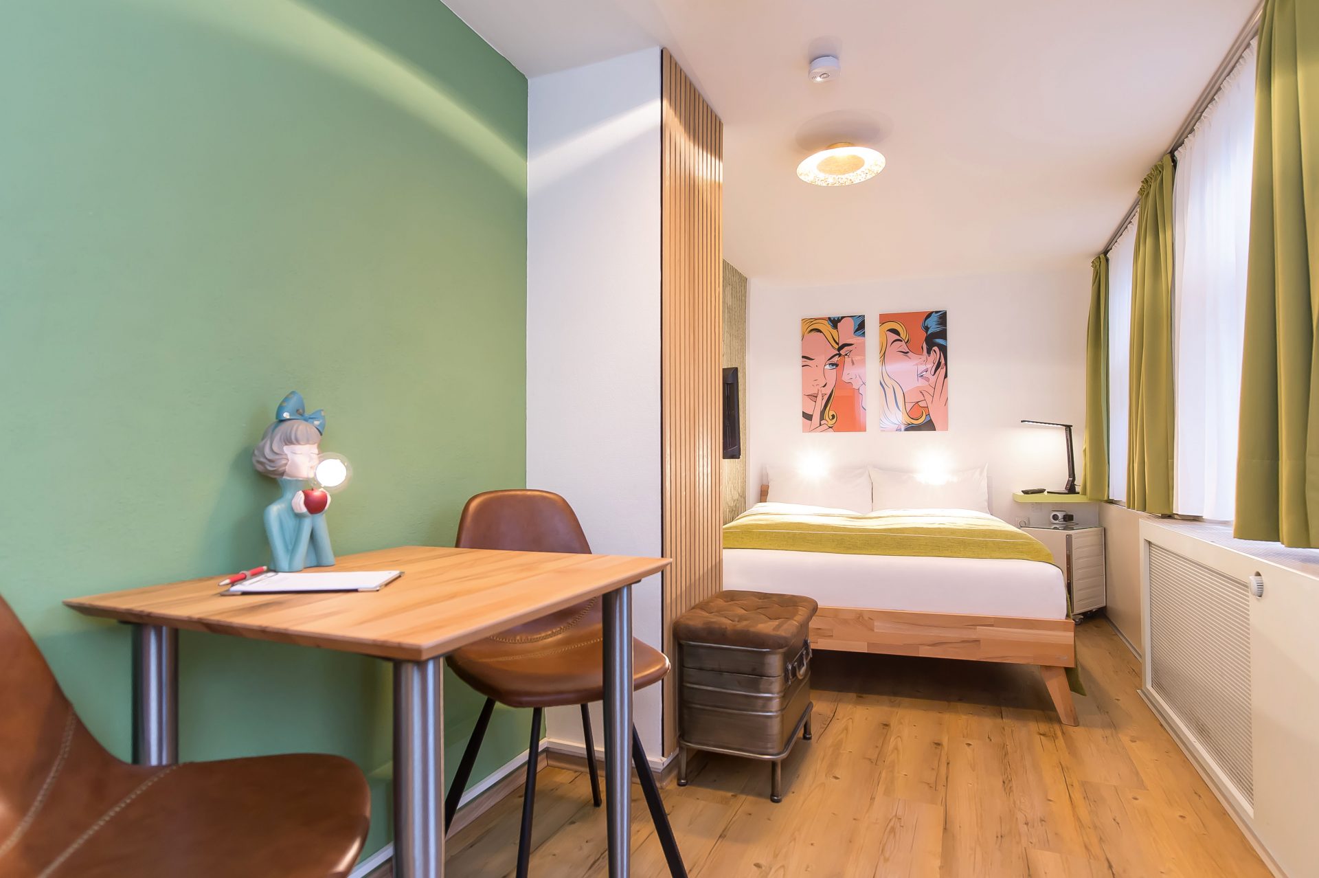 Modern eingerichtete Zimmer mit einer angenehmen Größe (bis 20 m²) inklusive Sitzgelegenheit und einem Tisch (Bettenbreite 1,80 x 2,00 m).